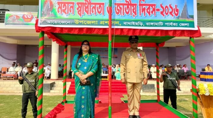 রাঙ্গামাটির বাঘাইছড়ি উপজেলায় মহান স্বাধীনতা ও জাতীয় দিবস-২০২৬ যথাযোগ্য মর্যাদা, উৎসবমুখর পরিবেশ এবং নানা আয়োজনের মধ্য দিয়ে উদযাপিত হয়েছে। বৃহস্পতিবার (২৬ মার্চ) সূর্যোদয়ের সাথে সাথে ৩১ বার তোপধ্বনির